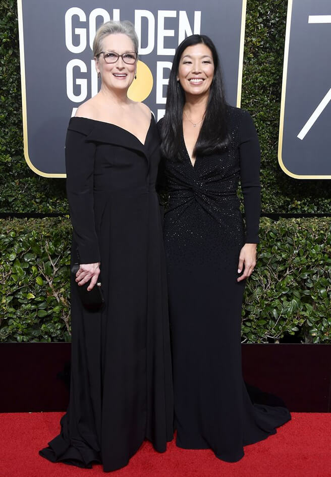 심플한 오프숄더 블랙 드레스를 입은 메릴 스트립. 업두 헤어와 안경으로 지적인 이미지를 가감 없이 드러냈다. 그의 옆을 지키는 여성 운동가 아이젠 푸.