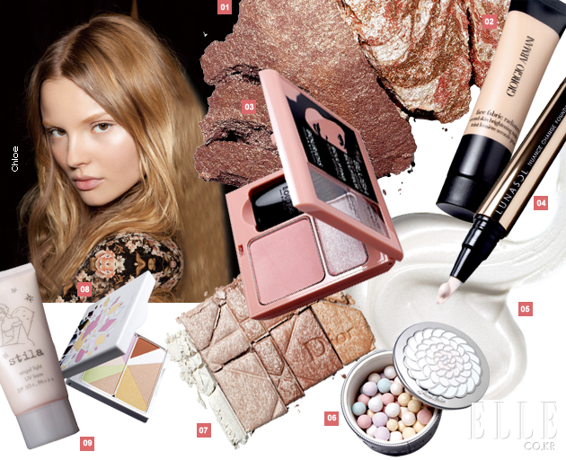 1 MAC 미네랄라이즈 블러셔, 라이트 오버 다크, 3만3천원. 2 조르지오 아르마니 페이스 패브릭 래디언스. 5만9천원. 3 부르주아 블러시 듀오 에페, 페어 핑크. 2만8천원. 4 루나솔 뉘앙스 체인지 파운데이션 B, 01 베이지 글로우. 5만원. 5 랑콤 라 바즈 이드라 글로우. 5만5천원 6 겔랑 메테오리트 펄 일루미네이팅 파우더-퓨어 래디언스, 01로즈. 7만4천원. 7 디올 스킨 쉬머 파우더, 002 암브레 다이아몬드. 5만7천원. 8 슈에무라 플로레스 글로우 파우더. 가격 미정. 9 스틸라 젤 라이트 유브이 베이스 SPF50. 4만5천원.