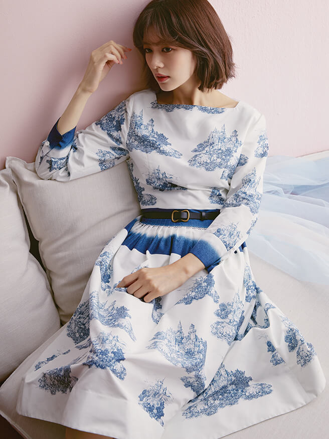 화려한 패턴이 프린팅된 플레어 드레스는 미샤(MICHAA) 80만원대