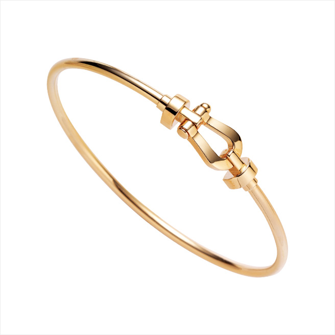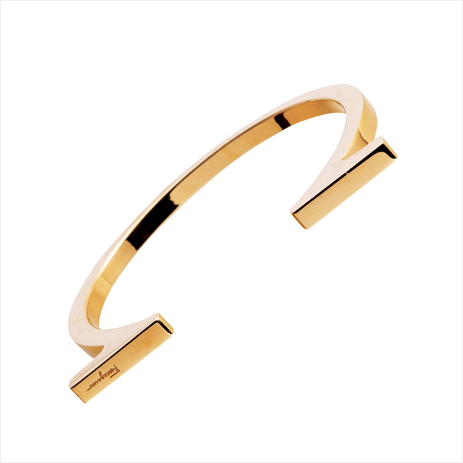 브랜드 심벌인 간치니 문양을 형상화한 골드 뱅글은 가격 미정, Salvatore Ferragamo.