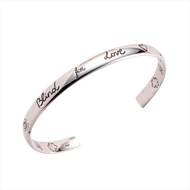 음각으로 장식된 레터링과 일러스트레이션이 로맨틱 분위기를 더하는 실버 뱅글은 40만원, Gucci Timepiecs & Jewelry.