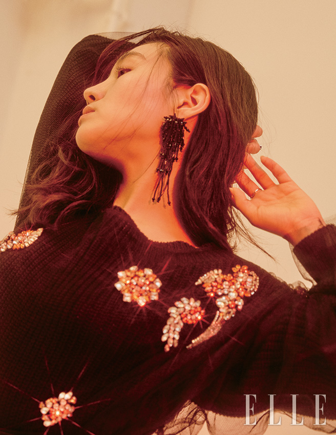 크리스털을 장식한 니트 풀오버는 Dries Van Noten. 드롭 이어링은 Vintage Hollywood. 골드 링과 블랙 원석의 링은 모두 Haesool. 실버 링은 Katenkelly.