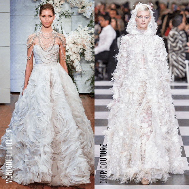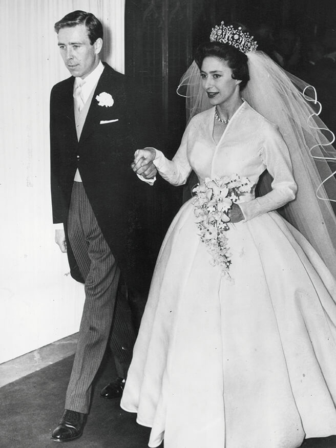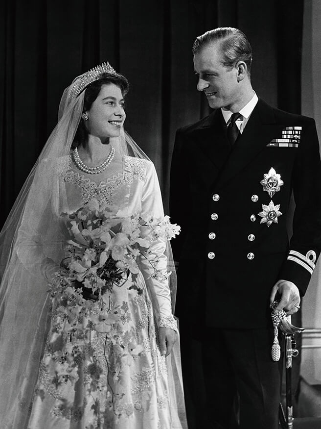 엘리자베스 2세 여왕은 노먼 하트넬의 크리스털과 진주, 투명한 아플리케가 장식된 화려한 아이보리 컬러의 실크 드레스를 입고 웨스트민스터 아비를 걸어 들어갔다. 롱 베일과 크라운, 전대 왕비들이 착용했던 진주 목걸이를 한 채 로열 오차드로 만든 부케를 들고 왕실의 호화로움을 강조했다. 스커트에도 물결 라인의 자수 디테일이 더해진 여왕의 드레스는 2018 S/S 시즌 섬세한 자수와 플라워 아플리케가 스커트 위에 수놓은 웨딩드레스로 대변된다. 특히 과감한 진주와 주얼리의 사용이 눈에 띄는데 니암 칸, 모니크 륄리에 등은 어깨를 감싸며 드리우는 방식으로 주얼 장식이 웨딩드레스에 포인트가 됐다.