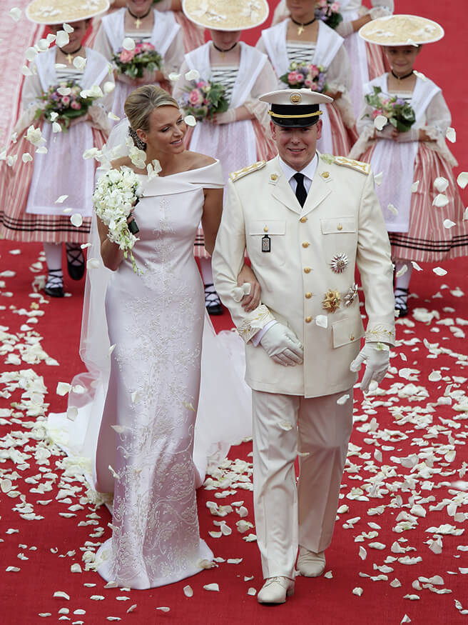 케이트 왕세자빈 이전에 이미 현대판 신데렐라로 불린 남아프리카 공화국 출신의 올림픽 수영선수 샤를렌 위트스톡과 그레이스 켈리의 아들인 모나코 왕자 알베르2세의 로열 웨딩. 그녀의 넓은 어깨를 가린 오프숄더 웨딩드레스는 조르지오 아르마니의 작품으로 화이트 실크에 20m에 달하는 트레인으로 웅장함을 살렸다. 슬림한 라인이 자연스럽게 실루엣을 드러내는 드레스는 요란하지 않고 심플해 장신인 그녀에게 더할 나위 없는 선택. 이렇게 미니멀한 슬림 스타일에 좀 더 특별함을 주고 싶다면 트레인에 변화를 주는 것도 방법. 안토니오 리바의 레이스 트레인이나 커다란 리본 장식을 단 이니스 디 산토를 참고할 것.