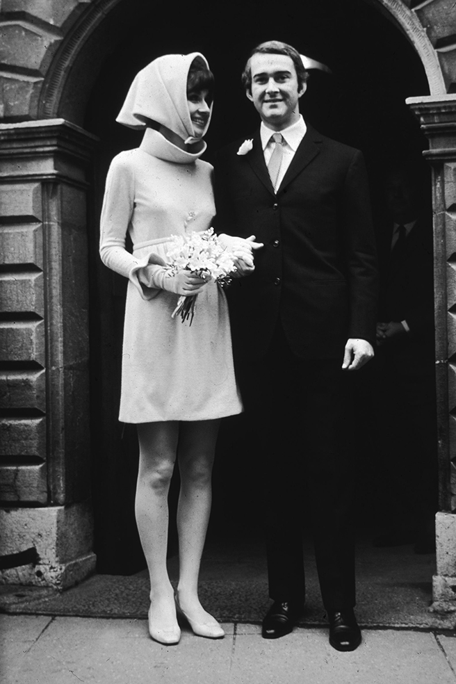 안드레아 도티와의 결혼식에서 착용한 미니 드레스. 오드리 헵번의 사랑스러운 매력을 강조하는 프릴 디테일의 소매와 머리에 두른 스카프의 조합이 인상적이다.