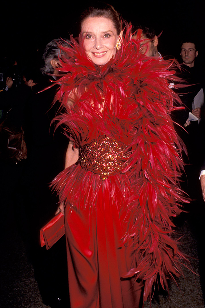 디자이너가 캘리포니아의 첫 번째 공로상을 수상하던 순간, 오드리 헵번은 강렬한 깃털 장식의 옷을 입고 우정을 증명했다.