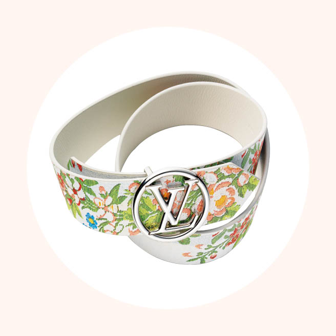 정교한 플라워 프린트의 레더 벨트는 가격 미정, Louis Vuitton.