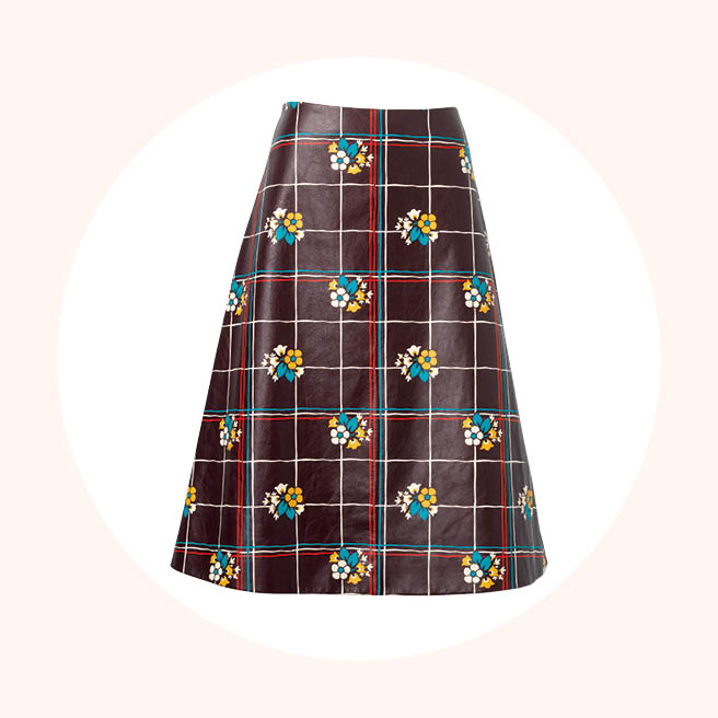 그래픽적인 체크 패턴과 플라워 프린트가 조화로운 레더 스커트는 가격 미정, Miu Miu.