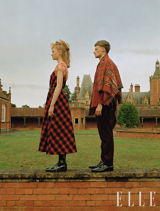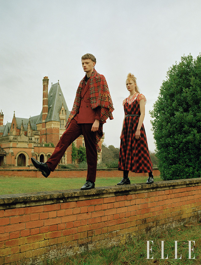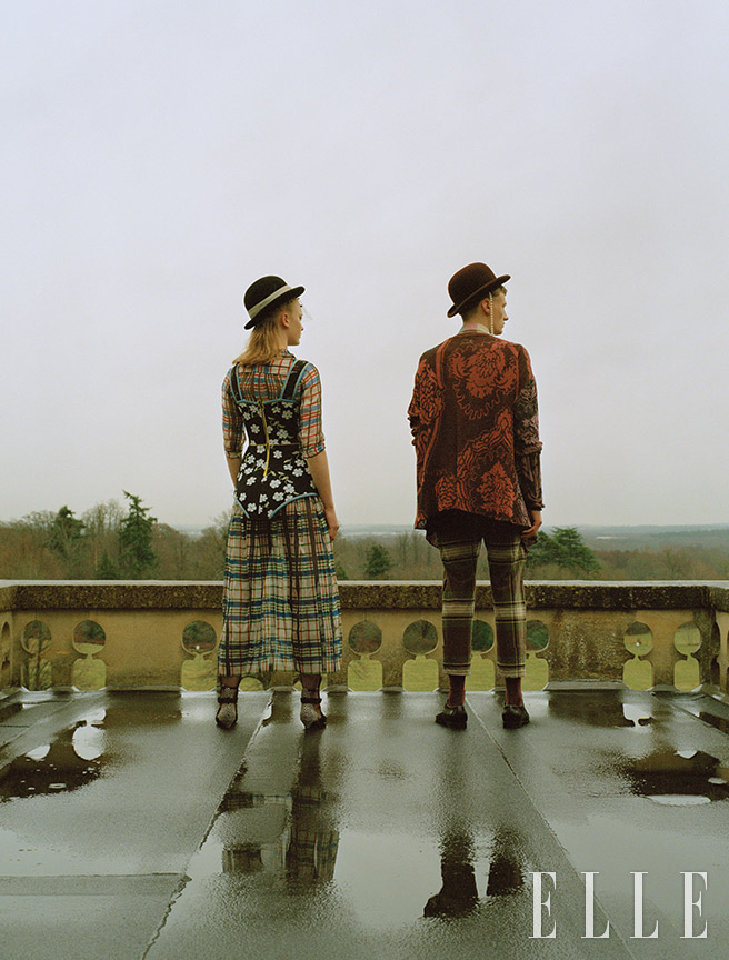 (왼쪽) 올더니가 입은 체크 패턴의 니트 톱은 1610파운드, 체크 패턴의 실크 스커트는 710파운드, 겉에 입은 플라워 패턴의 오버올 드레스는 1480파운드, 모두 Marni. 스웨이드 부츠는 1050.68파운드, Givenchy. 나일론 타이츠는 4.99파운드, Pamela Mann. 베일 디테일을 더한 펠트 페도라는 550파운드, Maison Michel. (오른쪽) 도허티가 입은 실크 카디건은 600파운드, 체크 팬츠는 365파운드, 모두 Vivienne Westwood. 삭스는 15파운드, London Sock Company. 레더 로퍼는 460파운드, Dsquared2. 체인이 장식된 펠트 페도라는 1060파운드, Maison Michel.