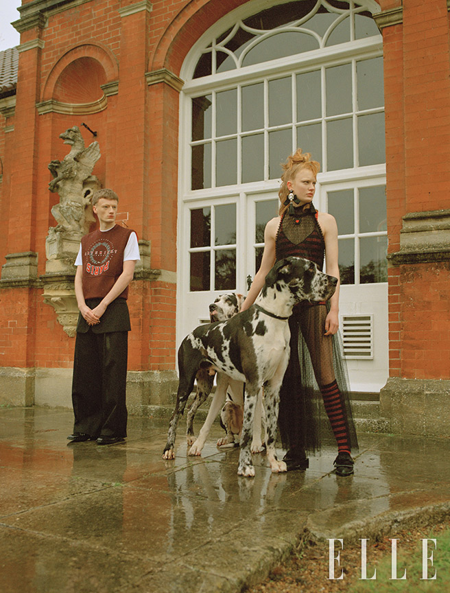 (왼쪽) 도허티가 입은 면 소재의 프린트 스웨트셔츠는 500파운드, 안에 입은 면 티셔츠는 320파운드, 울 팬츠는 1100파운드, 모두 Dior Homme. 가죽 신발은 375파운드, Zadig & Voltaire. (오른쪽) 올더니가 입은 자수 장식의 드레스는 8900파운드, 비스코스 보디수트는 1300파운드, 캐시미어 삭스는 300파운드, 모두 Dior. 레더 슈즈는 475파운드, Shushu/Tong. 실크와 유리로 이뤄진 이어링은 315파운드, Ranjana Khan.