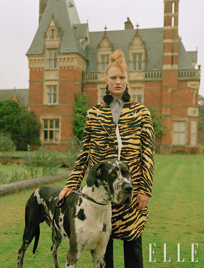 레오퍼드 패턴의 데님 코트는 1720파운드, 포플린과 브로케이드 셔츠 드레스는 1720파운드, 면 팬츠는 735파운드, 모두 Prada. 유리와 크리스털, 페이크 퍼로 이뤄진 이어링은 290파운드, Ranjana Khan.