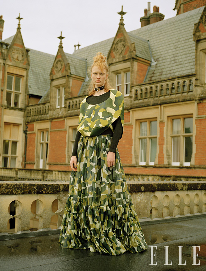 카무플라주 패턴의 톱은 771파운드, 맥시 풀 스커트는 가격 미정, 모두 Junya Watanabe. 면 보디수트는 130파운드, Wolford. 초커는 190파운드, Moschino.