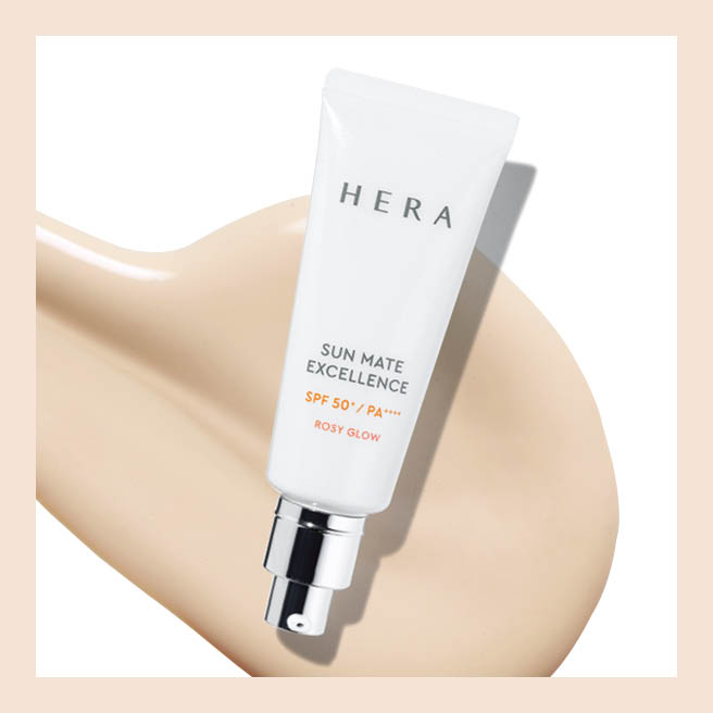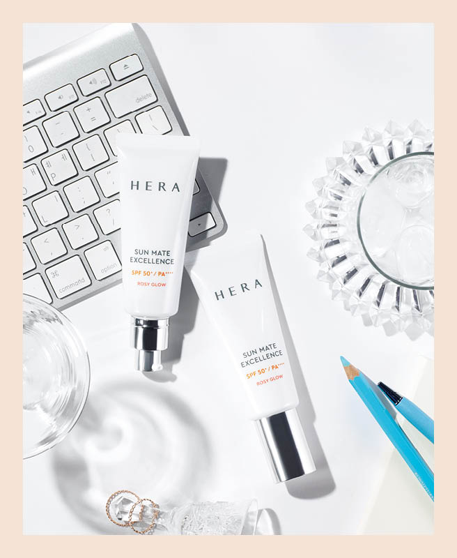 피부에 유해한 블루라이트는 필터링하고, 피부를 예쁘게 보정하는 광채 베이스 기능에 미백, 안티폴루션, 안티에이징 등 트리플 케어 효과까지 더한 똑똑한 자외선차단제. 선메이트 엑설런스, 40ml 4만5천원대, Hera.