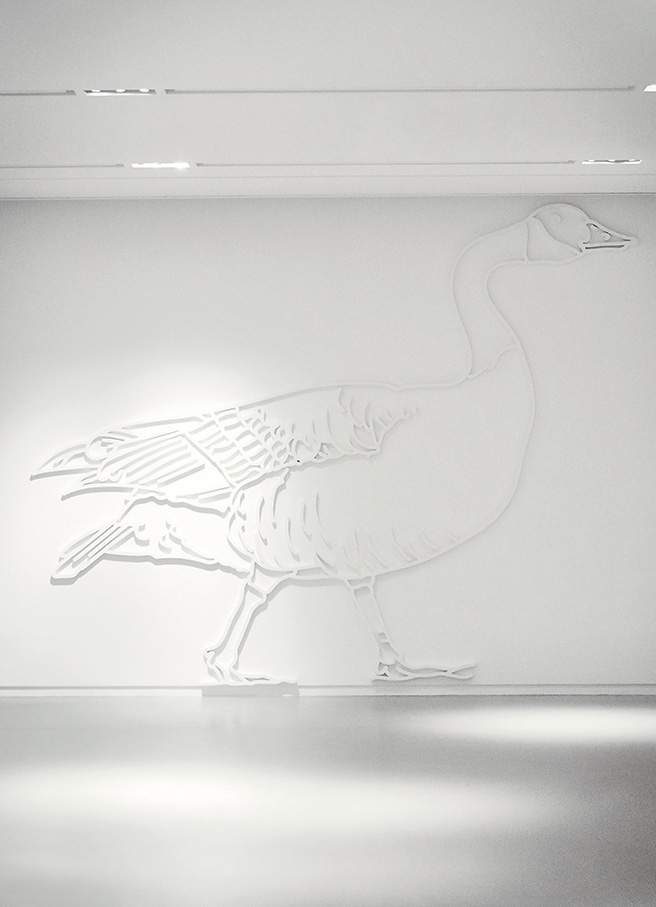 설치미술 작품 중에 참새, 비둘기, 닭, 오리 등 다른 종류의 새들도 보여요. 그중에 캐나다 구스가 있던데 영국 유학을 마치고 한국에 왔을 때 굉장히 추웠어요. 한국의 겨울은 롱 패딩 없이 지낼 수 없다는 걸 몰랐죠. 사람들이 구스가 어쩌고, 오리가 어쩌고 하는 걸 보면서 유난스럽다고 생각하면서도 한편으로는 서글프기도 했어요. 브랜드 이름조차 캐나다 구스라니. 본질과는 거리가 있는 논쟁에 휘말린 캐나다 구스가 제 고민과 맞닿은 면이 있어서 전시에 데려와야겠다고 생각했어요.