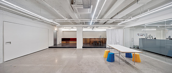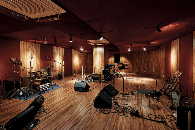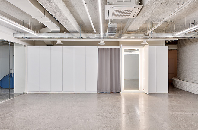 합주실 공간 구조가 재미있더라. 미로 같은 통로지만 결국 하나로 연결되어 있는 것도 그렇고, 벽이 움직이는 것도 그렇고 여러 사람이 쓰는 공간이니까 공간을 좀 나눠서 쓸 수 있도록 했다. 큰 벽 하나가 움직이는데, 그 벽의 위치가 어디에 있느냐에 따라 합주실과 스튜디오가 분리되기도 한다.