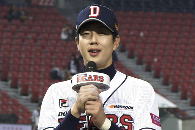 데뷔 10년차 어느덧 팀의 중견으로 자리 잡은 박건우. 그러나 거짓말 조금 보태서 2018년 신인들과 비교해도 동갑 친구처럼 보일 만큼 동안 외모를 자랑한다. 참고로 그의 데뷔 초 별명은 ‘얼빠생성기’로 ‘얼굴을 보고 팬된 사람이 많아서’란 뜻이었다. ‘자작’이 의심스럽지만 10년 전 박건우라 생각해 보면 고개가 끄덕여진다. 올 시즌 기록은 21경기 타율 .289(90타수 26안타)를 기록 중이다.
