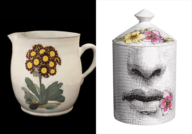 선반 위에 올려진 피쳐는 아스티에 드 빌라트의 제품으로 ‘PRIMROSE PITCHER’, 여자의 입술이 그려진 것은 포르나세티의 ‘Fior di Bacio’ 캔들이다. 포르나세티는 이탈리아의 화가이자 조각가, 인테리어 디자이너 피에로 포르나세티가 창립한 브랜드로, 그림과 패턴이 생소해 보일 정도로 독특하고 직관적이다. 포르나세티는 2016년에 국내 DDP에서 전시회를 열었을 정도로 디자인 측면에서 인정받은 바 있다. 캔들 가격은 19만원대.