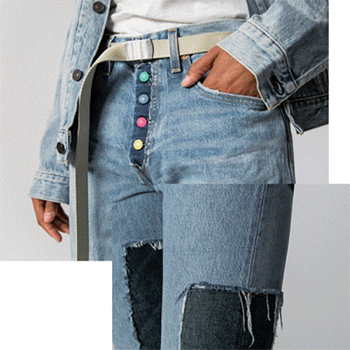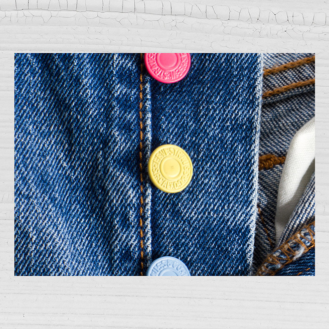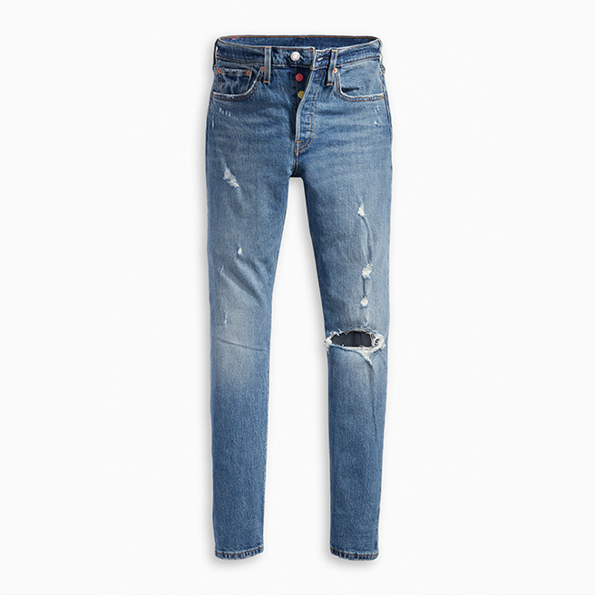 알록달록한 아이스크림 컬러의 단추가 달린 501 진. 파스텔 컬러 단추와 찢어진 디스트로이드 디테일에서 여름 무드가 물씬 풍긴다.