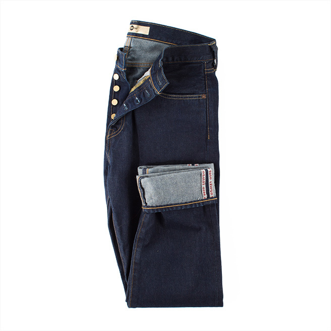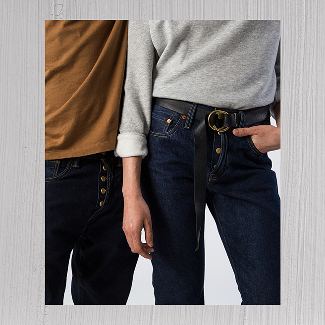 이번 시즌 처음 출시된 금색 단추의 501 셀비지 진. 청바지 마니아들 사이에서도 희귀템으로 손꼽히는 1947년산 501 바지를 우연히 발견한 리바이스는 산화되어 금색으로 변해버린 단추에서 영감을 얻어 이 제품을 디자인했다.