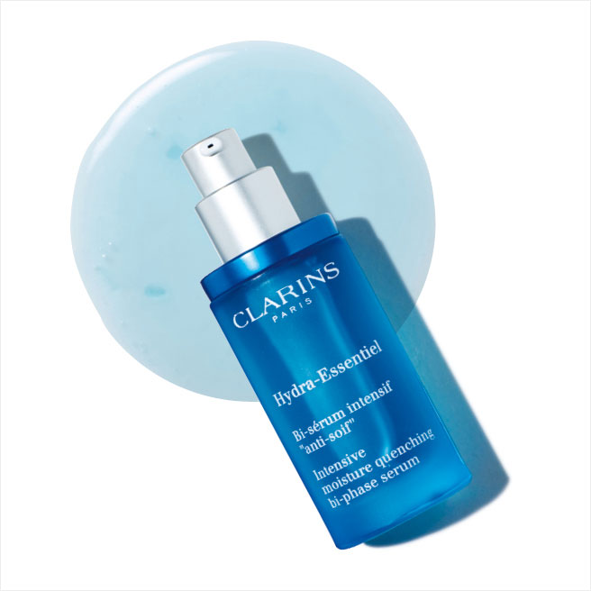 하이드라-에센셜 인텐시브 바이-페이즈 세럼, 10만6천원, Clarins. 욕실에 두고 세안 직후에 흔들어 빛의 속도로 발라주자. 수분 층과 오일 층, 두 개 층이 흐트러진 유수분 밸런스를 맞춰 광채를 머금은 피부로 가꿔준다.