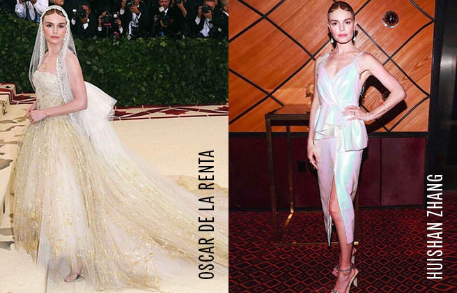 오스카 드 라 렌타의 장인 정신을 입은 아사 모사한 드레스 자락을 휘날리며 우아한 성모 마리아로의 변신에 성공한 케이트 보스워스. 축제가 끝나고 난 뒤 그녀는 중국 디자이너 후이샨 장의 2018 가을/겨울 컬렉션 드레스로 갈아입었다. 애프터 파티에서도 우아하기는 마찬가지! 빛의 각도에 따라 다채로운 매력을 어필하는 메탈릭한 원단의 드레스가 시선을 강탈한다.
