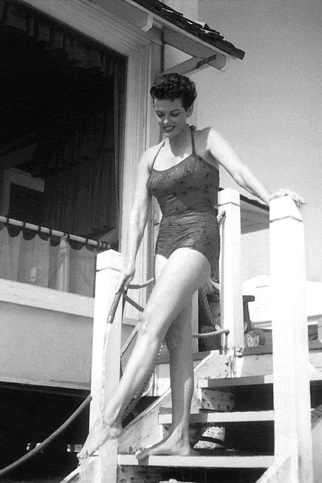 마릴린 먼로와 쌍벽을 이루는 미국의 대표적인 여배우 제인 러셀. 당시 그녀가 입으면 어려운 옷도 패션이 됐다. 한 벌의 수영복으로 멋진 몸매 라인을 강조할 수 있다는 것을 몸소 증명한 한 장의 사진. 탱크 톱과 마이크로 팬츠를 합쳐놓은 듯 보수적인 스타일의 디자인이 수영복의 유행을 예고한다.