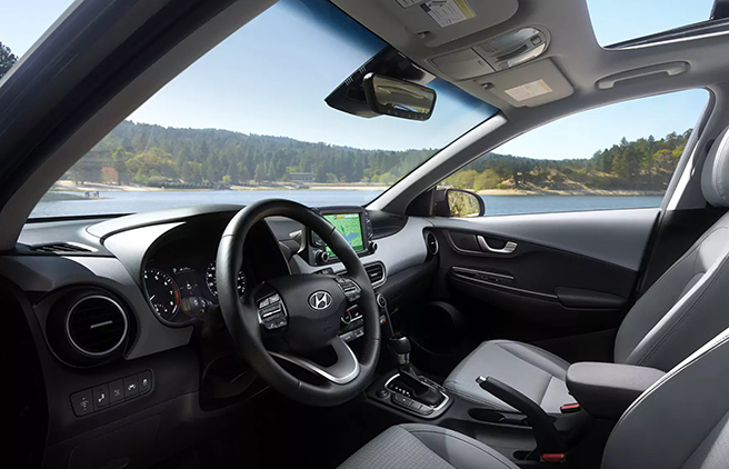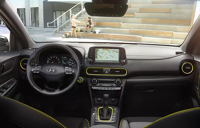 검은 바탕 위에 라임 컬러가 포인트로 사용됐다. 워즈오토는 코나의 인테리어 컬러 매치를높게 평가했고, 헤드업 디스플레이와 8인치 인포테인먼트 시스템의 기능도 우수하다 이야기했다. 특히 자동차 가격 대비 인테리어 디자인과 소재 퀄리티가 좋은 점을 높이 샀다.