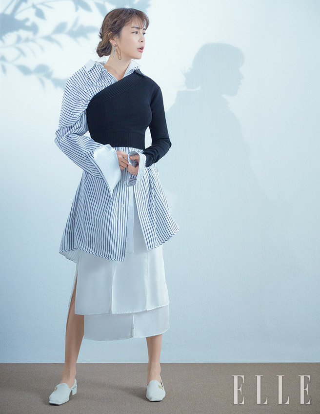 셔츠 원피스와 원 숄더 니트 톱은 모두 juun.J. 스커트는 Recto. 이어링은 Viollina. 슈즈는 Nina Ricci.