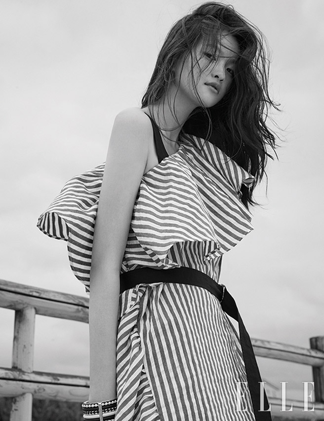 러플 장식의 원 숄더 드레스는 가격 미정, Eudon Choi. 에스닉 무드의 뱅글은 가격 미정, Hermes.