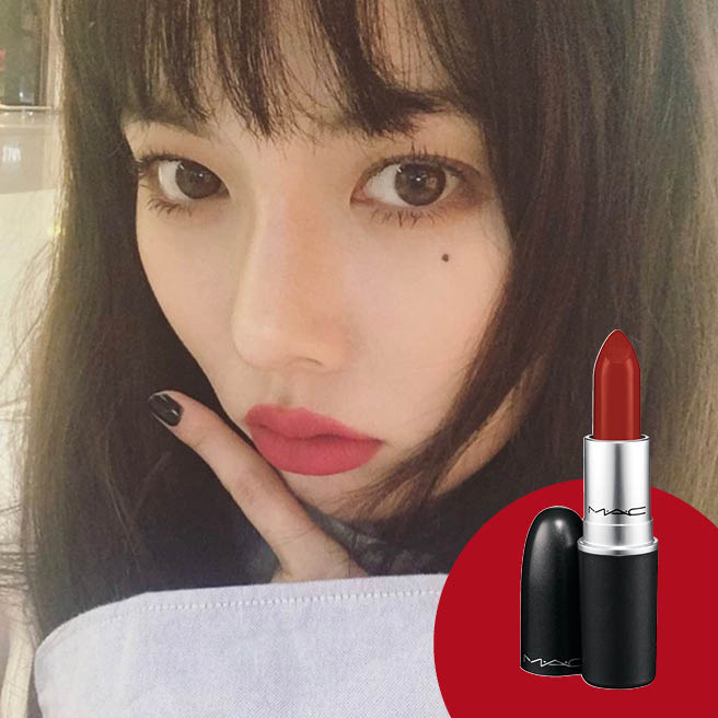 언제나 통통 튀고 상큼한 현아만큼 레드 립을 잘 어울리는 스타가 있을까. 현아는 자신의 SNS에 새하얗고 투명한 피부를 더욱 강조하는 레드 립 셀카를 올려 화제가 되었다. 현아가 선택한 제품은 맥의 루비 우(3만원)로 레드 립스틱의 정석인 제품. 쿨톤에게 잘 어울리는 컬러로 수많은 스타들의 인생 립이기도 하다.