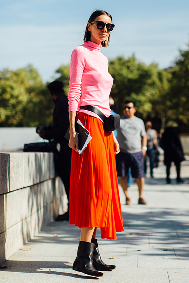 네온 컬러는 보기보다 다양한 컬러와 조화를 이룬다. 채도의 정도를 조절한 에메랄드 컬러의 블라우스와 옐로 컬러의 셔링 스커트로 스타일링을 마무리한 스트리트 걸.