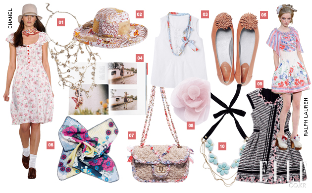 1 밀 모티브의 오버사이즈 네크리스. 가격 미정. 샤넬. 2 플로럴 패치워크의 모자. 5만8천원. 그레이스 햇츠 by 햇츠 온. 3 리본 네크리스가 장식된 화이트 프릴 톱. 가격 미정. 기비. 4 전원풍의 스카프. 가격 미정. 기비. 5 목가적이면서도 걸리시한 감성의 패션 화보. 6 프린지 장식의 브라운 레더 플랫 슈즈. 20만원대. 에스쁘렌도 by 금강제화. 7 트위드 소재의 밀 모티브 체인 스트랩 숄더백. 가격 미정. 샤넬. 8 라피아 소재의 핑크 플라워 브로치. 가격 미정. 샤넬. 9 플라워 디테일의 블랙 트위드 원피스. 가격 미정. 샤넬. 10 골드 체인과 블랙 스웨이드 스트랩의 네크리스. 가격 미정. 쥬시 꾸뛰르.