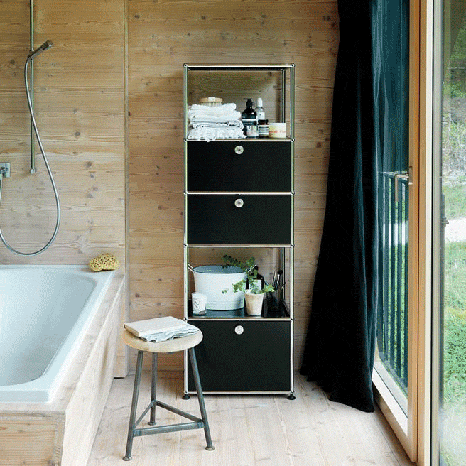 여러 형태의 물건도 컬러 매치만 잘하면 멋지게 스타일링할 수 있다. 강민경은 거실을 화이트, 베이지, 블랙 등 모노톤의 색감을 주로 사용했다. 원목 바닥과 어울려 안정적이고 자연스러운 분위기다. 그녀가 TV 장으로 선택한 것은 모듈 가구 브랜드 USM이다. 국내 대부분의 사람들이 USM을 강민경처럼 거실 TV장으로 사용하는데, 해외에서는 침대 뒤에 두고 수납 가능한 침대 헤드처럼 사용하기도 하고, 공간을 분할하는 파티션 등 다양한 용도로 사용한다.