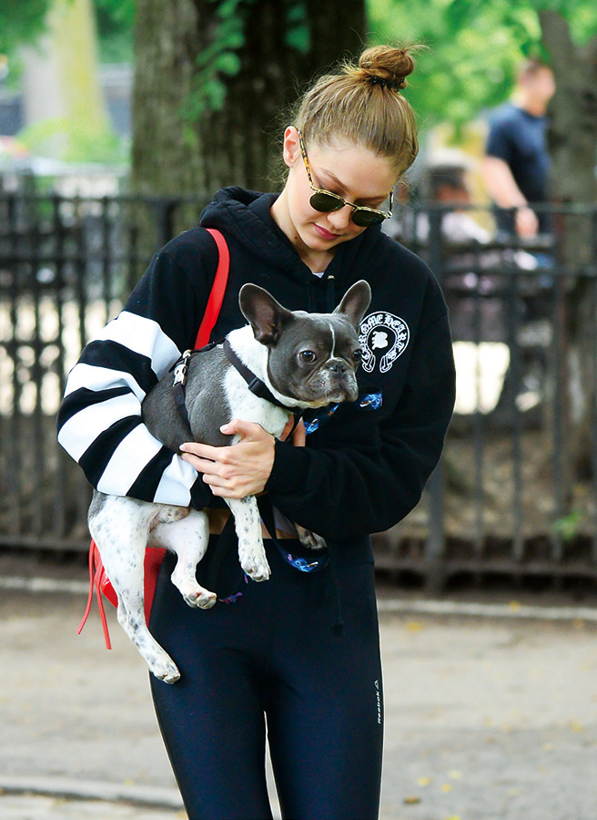 지지 하디드의 일상 속 소확행은? 편한 차림으로 남자친구의 반려견 퓨리와 집 앞 공원 산책하기. 지난 2015년, 유년기 시절을 함께했던 강아지 럭키가 무지개 다리를 건넌 후 실로 오랜만에 본 애견인 면모.