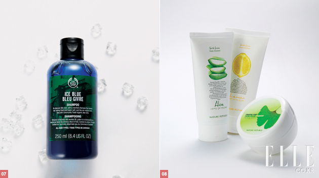 7 the body shop ice blue shampoo 질감★★ 사용감★★ 마무리감★★★ 멘톨이 두피를 상쾌하게, 알로에베라가 모발을 부드럽게 가꿔주는 제품. 멘톨로 인해 두피가 화끈거리는 시원한 사용감을 생각하기 쉽지만 청량감이 느껴지는 향기 외에 특별한 자극은 없는 편이다. 거품도 충분히 나고 잘 씻겨서 샴푸 직후 모발이 뽀득거리는 느낌은 들고, 린스로 마무리하기만 하면 두피와 모발 건강을 모두 지킬 수 있었다. 250ml. 1만4천5백원. SU YOUNG