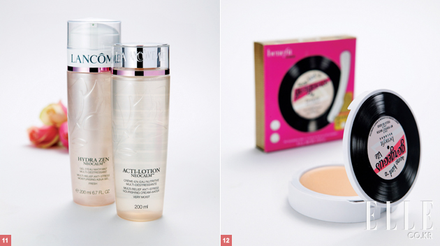 11 LANCOME hydra zen cream water & aqua jell fresh 질감★★ 사용감★★ 마무리감★★★ 피부 진정과 수분, 영양 공급 효과가 탁월한 ‘크림 워터’는 화장솜에 덜어 피부를 닦아내는 화장수의 일종. 워터 타입이라 끈적이지 않고 산뜻해서 사용하기 무난했다. 한편 ‘아쿠아 젤 크림’은 가볍고 묽은 젤 타입으로, 피부에 닿자마다 물로 바뀌는 신개념 스킨 로션. 빠른 흡수력과 촉촉한 발림성, 시원한 청량감이 기분을 상쾌하게 해주며 그 어떤 피부 타입에도 적합할 듯하다. 각각 200ml. 5만4천원대. SU YOUNG