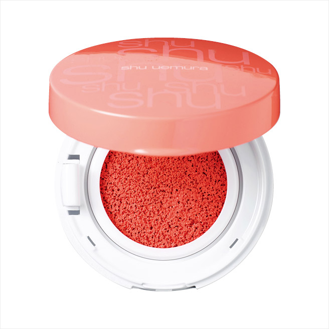 프레쉬 쿠션 블러셔, 프레쉬 코랄, 4만원대, Shu Uemura. 유행하는 수채화 발색의 블러셔. 파우더나 크림 타입으로는 표현할 수 없는 ‘물먹’ 효과를 드리워준다. 지속력이 조금 아쉽지만 아무리 덧발라도 뭉치지 않으니 걱정 없을 것.