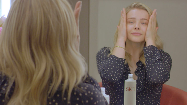 SK2 피테라 에센스로 민낯 화보를 준비하는 클로이 모레츠