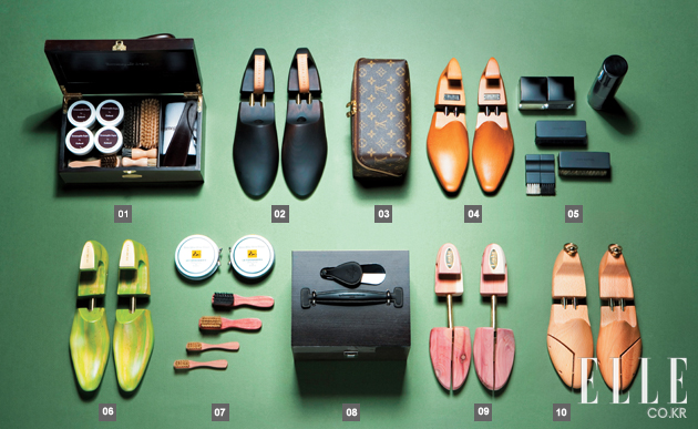 1 슈즈 케어 키트 35만원 에르메네질도 제냐 2 블랙 슈트리 31만2천원 루이 비통 3 가죽 파우치에 담긴 슈즈 케어 키트 1백2만5천원 루이 비통 4 브라운 슈트리 21만원 벨루티 5 루이 비통 슈즈 키트 구성품 6 그린 슈트리 11만원 란스미어 7, 8 슈즈 케어 키트 62만9천원 라꼬르도네리 앙글레제 by 일 치르꼬 9 우드 슈트리 6만5천원 로크 by 라 피규라 10 브라운 슈트리 13만5천원 라꼬르도네리 앙글레제 by 일 치르꼬