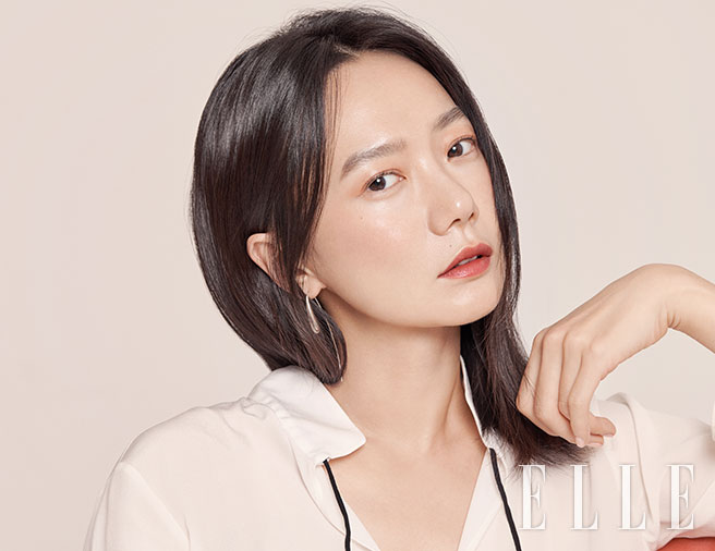 화이트 블라우스는 Giorgio Armani, 귀고리는 L’eclat.
