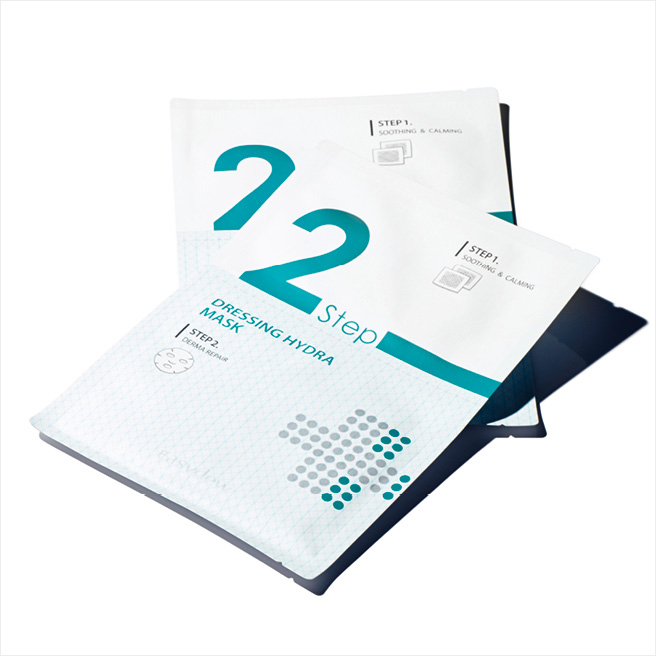 상단의 드레싱 거즈로 피부를 진정시키고 피부 구성 성분과 유사한 단백질 성분을 담은 하단의 시트 마스크로 마무리. 투 스텝 드레싱 하이드라 마스크, 1매 5천원, Easydew.