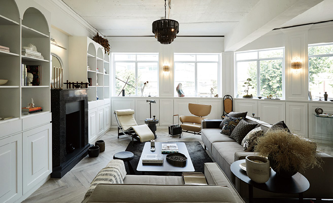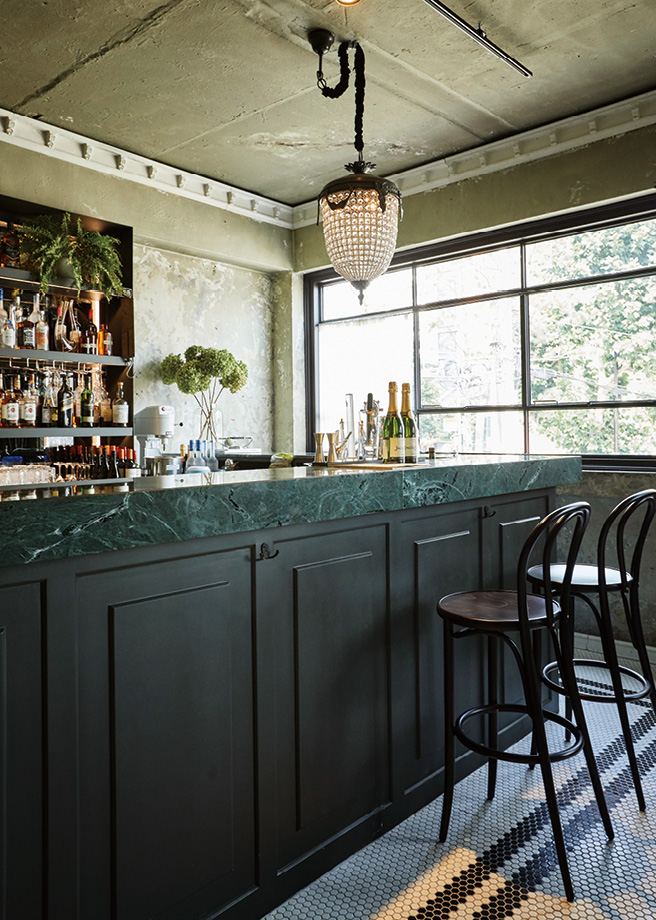 꿈틀거리는 성수동에서 뉴욕 브루클린의 바이브를 포착한 김석진 대표와 장호석 실장은 곧바로 그곳을 ‘호스팅하우스’의 둥지로 택했다. 그리고 신데렐라를 위해 요정이 호박마차를 만들 듯 인테리어 브랜드로서의 역량을 마음껏 발휘해 낡은 건물을 탈바꿈시켰다. 하나의 커다란 방 안에 거실과 주방, 욕실 테마 모두를 갖춘 로프트 형태의 쇼룸은 두 사람의 꿈이 집약된 장소로 남다른 섬세함이 느껴지는 곳. 자신들이 애정하는 국내외 브랜드 제품들로 새롭게 디자인한 공간에는 치밀하게 재단된 가구 배열에서부터 유연한 자신감이 흐른다. 외부와는 확연히 다른 분위기에 넋이 나가기도 잠시, 맞은편 카페의 초록색 페인트로 거칠게 칠한 벽 안쪽에서는 와플도 굽고, 메뉴에도 없는 칵테일을 뚝딱 만들어내는 멀티플레이어 바텐더가 기다리고 있다.