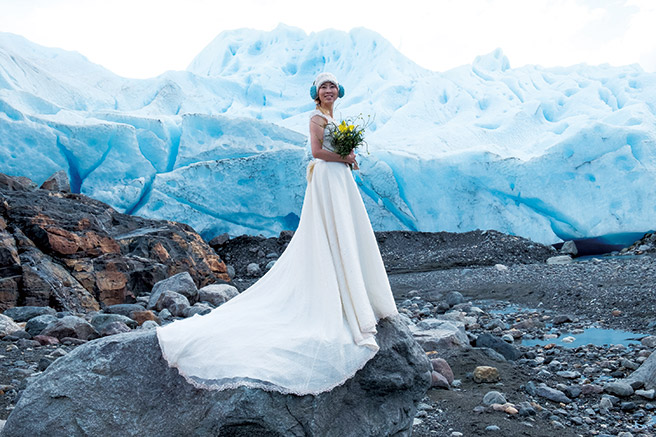 아르헨티나 페리토 모레노 빙하를 배경으로 선 순백의 신부.