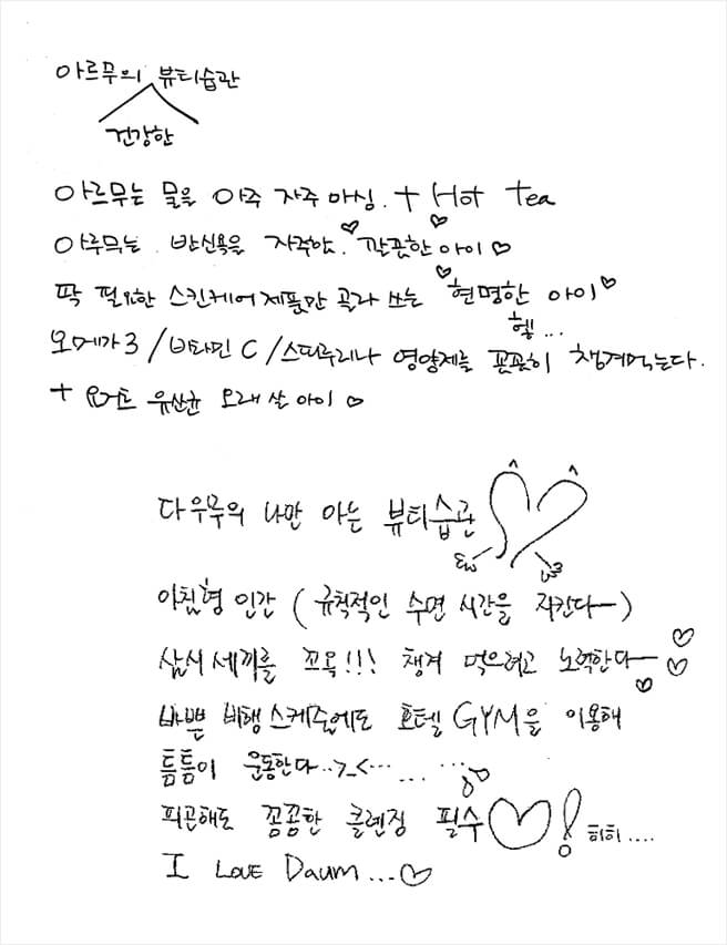 이런 건 고쳤으면 (다움) 아침밥 잘 챙겨 먹기! 승무원 업무상 식사 시간이 불규칙하거든요. 그러다 보면 위가 고장 나기도 하는데. 아름인 아침을 안 먹어서 간단하게라도 챙겼으면 해요. (아름) 다움이가 기내에서 수정 화장을 안 하더라고요. 파운데이션에 엘리자베스 에잇아워 크림을 조금만 섞어 바르면 피부가 촉촉하고 광이 나서 이 방법을 권하고 싶어요. 땅김 없는 환한 미소로 손님들을 대하길!