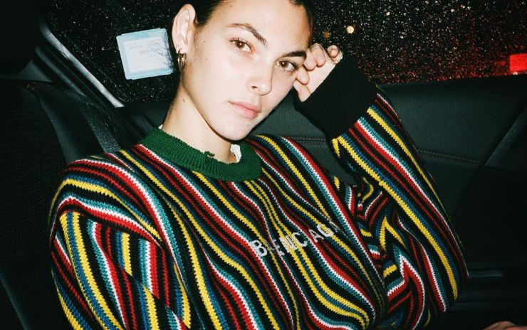 안아름이 입은 체크 재킷은 Sandro. 블랙 니트 드레스는 Off-White™. 안다움이 입은 레터링 니트는 MSGM by Hanstyle.com. 이어링은 Vintage Hollywood. 안아름과 안다움이 신은 블로퍼는 Rachel Cox.