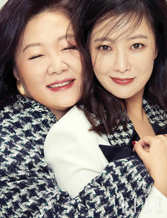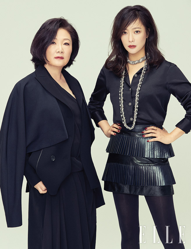 김해숙이 입은 블랙 테일러드 재킷은 Akris. 위에 레이어드한 라운드 숄더 셰이프의 재킷은 Low Classic. 비대칭 드레이프 디테일의 이너 톱은 Cos. 주얼 장식이 화려한 선글라스는 Miu Miu by Luxottica. 골드 싱글 이어링은 Monday Edition.김희선이 입은 블랙 실크 블라우스와 레더 플리츠스커트, 실버 다이아몬드 네크리스는 모두 Chanel.