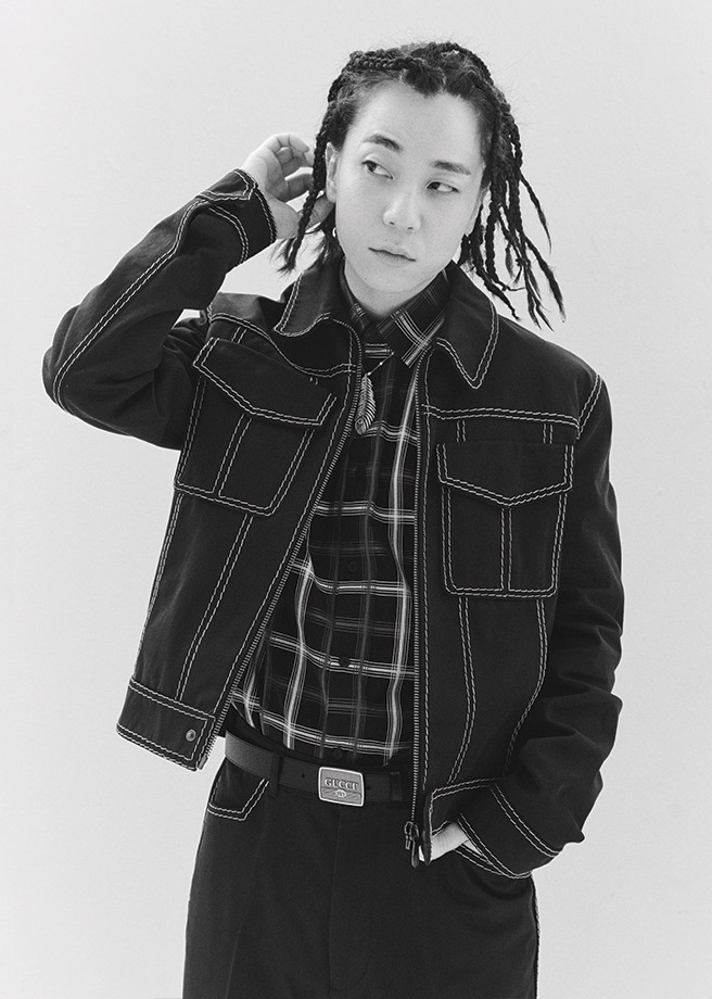 넉살이 입은 스티치 장식의 코튼 재킷과 체크 패턴 셔츠, 팬츠는 모두 Bottega Veneta. 깃털 포티브 네크리스는 ‘플륌드펑’ Boucheron.