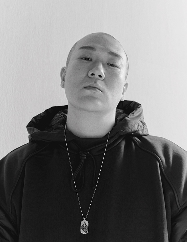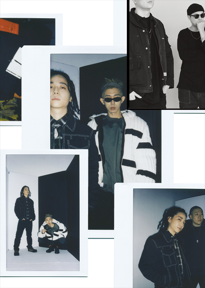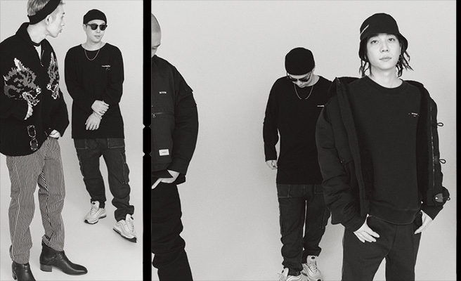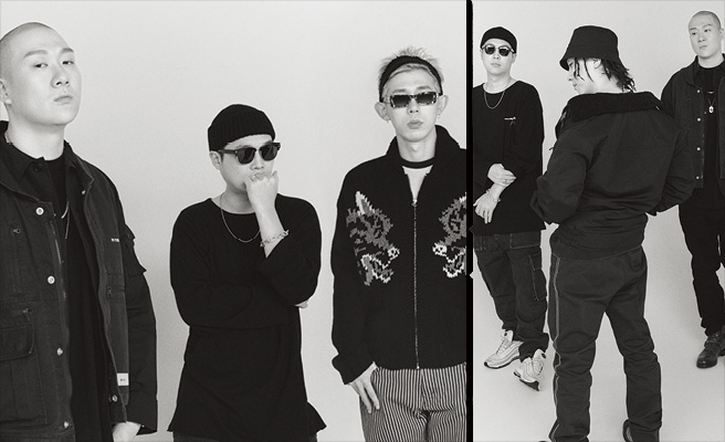 (왼쪽부터) 코드 쿤스트가 입은 니트 재킷과 팬츠는 모두 YMC. 선글라스는 off-whitetm, 레더 앵클부츠는 Bottega Veneta. 팔로알토가 입은 데님 카고 팬츠는 Juun. J. 네크리스와 브레이슬렛은 모두 Thomas Sabo. 딥플로우가 입은 베스트와 셔츠 재킷은 모두 WTAPS by Hoods. 펜던트 네크리스는 Chrome Hearts. 레더 부츠는 Berluti. 넉살이 쓴 버킷 햇은 Prada. 스웨트셔츠는 Off-White™. 패딩 재킷은 Tod’s. 앵클부츠는 3.1 Phillip Lim.