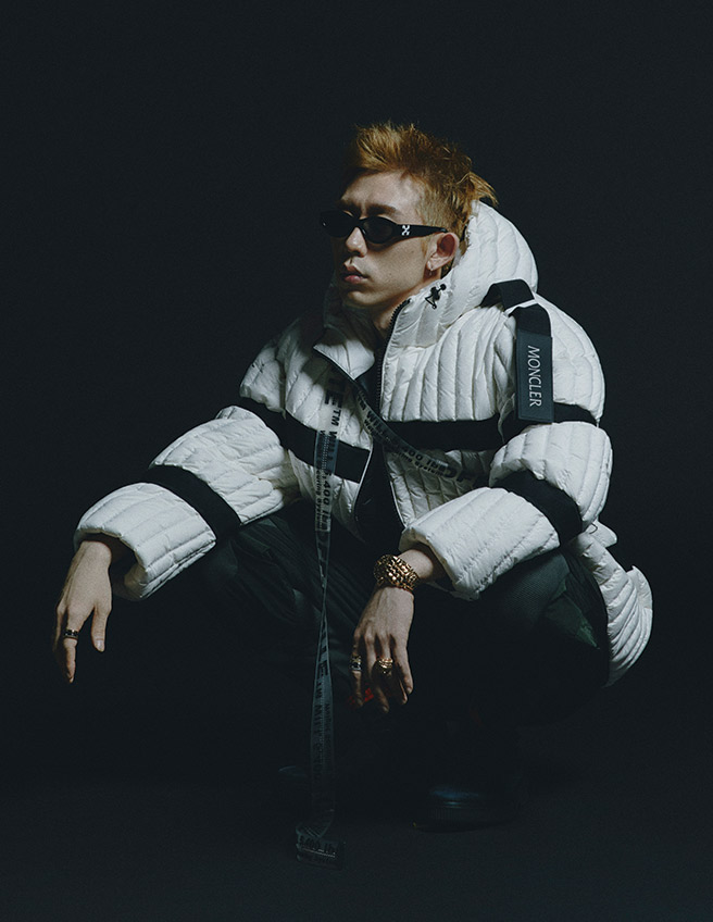 스웨트셔츠는 WTAPS by Hoods. 퓨처리즘 무드의 선글라스와 러버 벨트는 모두 Off-White™. 스트랩 장식의 패딩 재킷은 5 Moncler Craig Green. 스플릿 레더 앵클부츠는 Tod’s. ‘헤지 호그’ 링, ‘콰트로’ 링은 모두 Boucheron.
