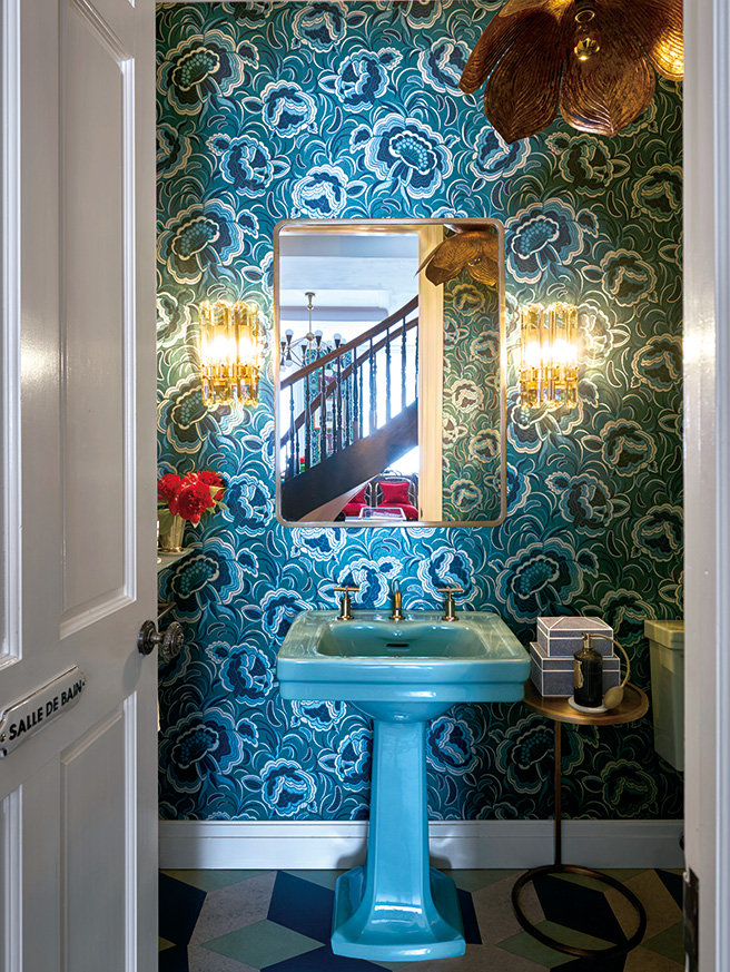 파우더 룸에 있는 세면대는 Toledo Architectural Artifacts. 벽면의 돌출 촛대는 Restoration Hardware. 천장 등은 Anthropologie. 거울은 Restoration Hardware Teen. 벽지는 Catherine Martin for Mokum.